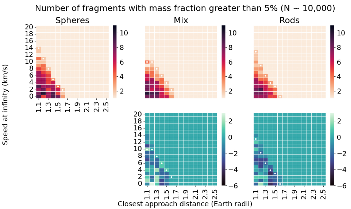 Heat maps of fragment production for trials S2, M2, and R2, including only fragments 5% or greater of the original rubble pile..