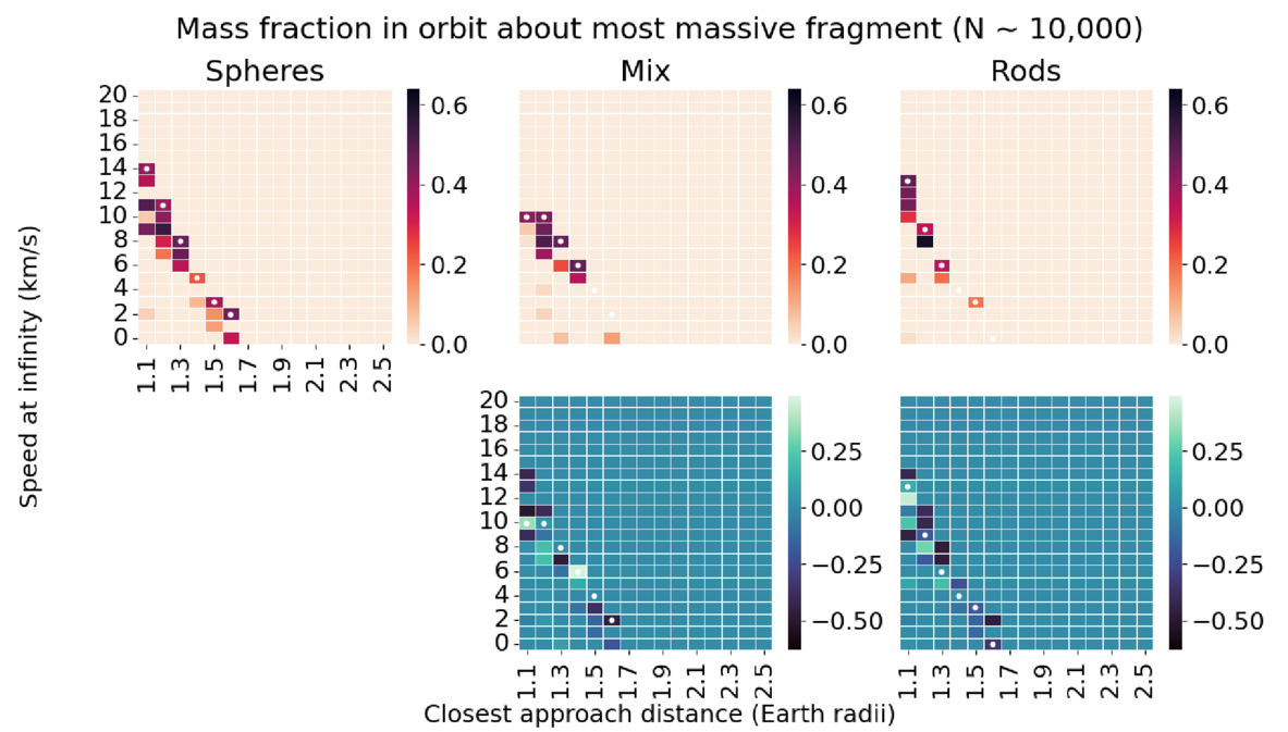 Heat maps of the mass fraction in orbit around the primary fragment for the higher-resolution trials S2, M2, and R2.