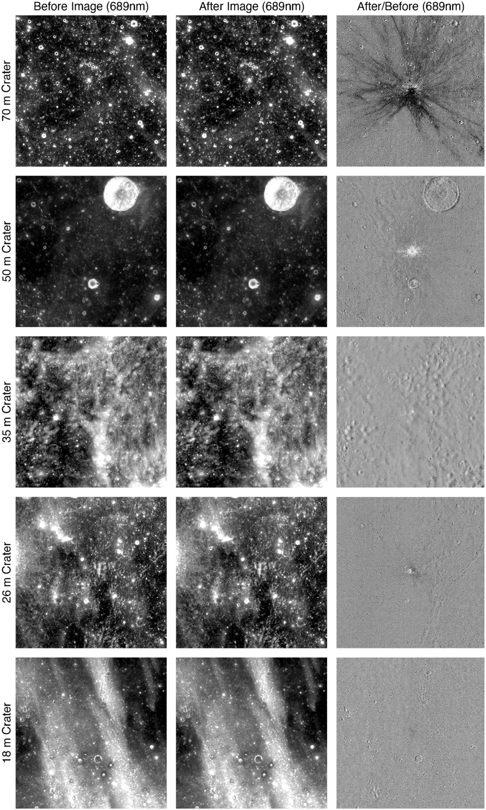 Averaged WAC images (689 nm band) and associated temporal image ratios of the five craters examined in this study. Each frame is 40 km across and is normalized to i = 30°, e = 0°, and g = 30°.