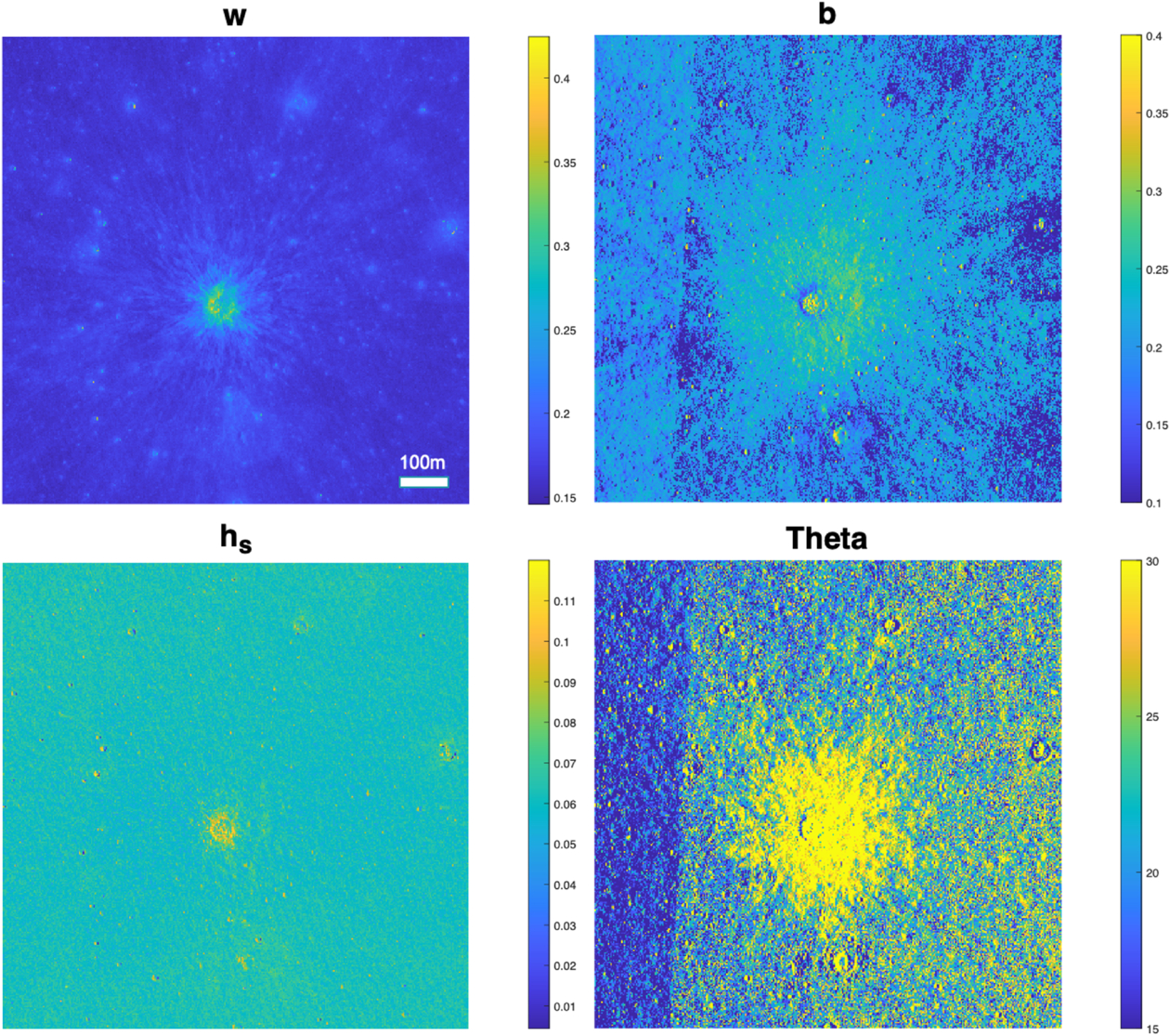 Hapke parameter map around a newly formed 50 m diameter crater. Definitions of each parameter are found in Table 2.