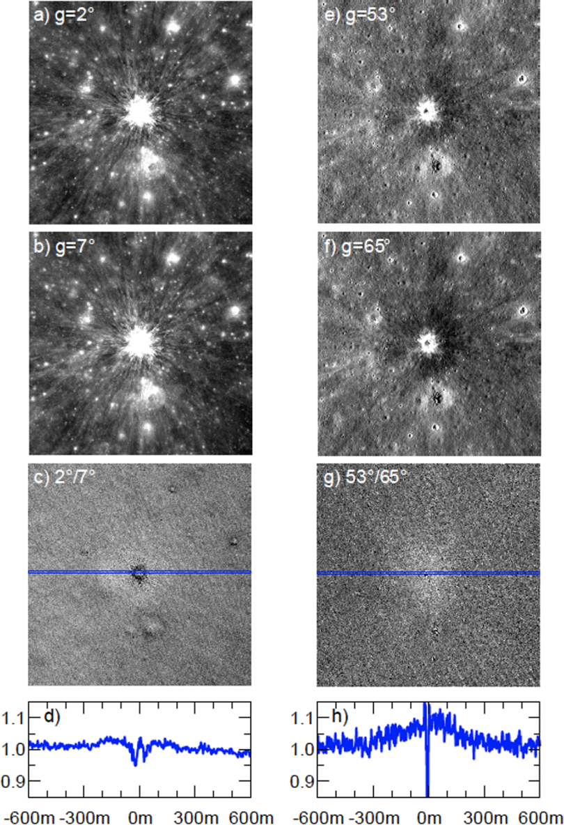 Phase angle ratio observations of a newly formed 50 m diameter crater. (a) LROC NAC M1269815537R, with i = 7°, e = 8°, and g = 2°. (b) LROC NAC M1254537038R, with i = 7°, e = 1°, and g = 7°. (c) Ratio and (d) cross-sectional profile of M1269815537R/M1254537038R. (e) LROC NAC M1219252124L, with i = 64°, e = 11°, and g = 53°. (f) LROC NAC M1234538225L, with i = 64°, e = 2°, and g = 65°. (g) Ratio and (h) cross-sectional profile of M1219252124L/M1234538225L.