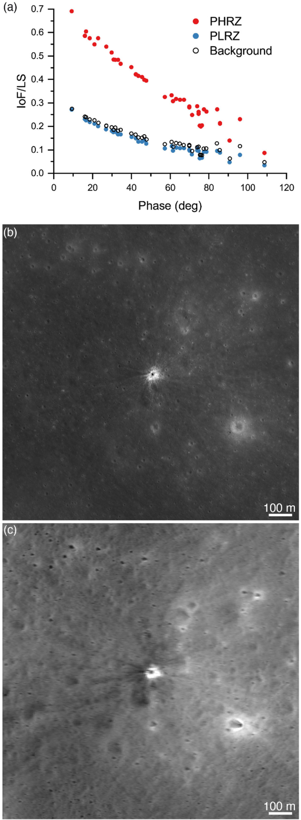 (a) Phase curve of the PHRZ and PLRZ and undisturbed background around a newly formed 35 m impact crater. (b)–(c) Medium- (g = 34°) and high-phase (g = 109°) observations of the crater (M1391091770L/R and M1266510073L).