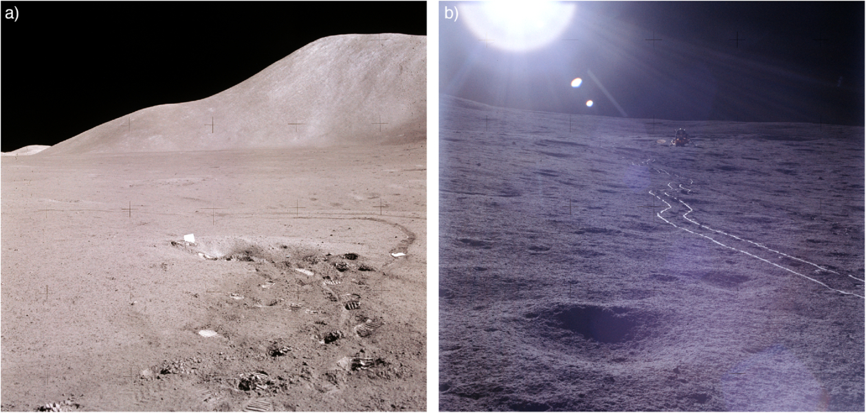 Photographs showing the effects of various surface disturbances caused by humans traversing the surface. (a) AS15-88-11927 shows local disturbances caused by astronaut boot prints. The increase in local roughness is likely analogous to the low-reflectance changes seen around newly formed impact craters. (b) AS14-67-09368 shows high-reflectance tracks caused by the local compaction of the surface from the wheels of the Modular Equipment Transporter (MET), or “rickshaw.” This compaction caused the destruction of the fairy castle structure and increased reflectance. Additionally, at the large phase angles, the surrounding area shows darkening due to the presence of small shadows introduced from fine-scale surface texture.