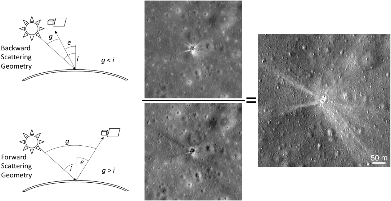An example image pair acquired at two different phase angles and a phase angle ratio image that suppresses albedo variations and highlights the slope of the phase curve. Both images in the ratio were acquired on 2013 January 31 with an incidence angle of ∼41°. The top LROC NAC image (M1114255849R) was acquired with an emergence angle of 23° and a phase angle of 19°, capturing the backward-scattering properties of the regolith. The bottom LROC NAC image (M1114241640R) was acquired with an emergence angle of 14° (opposite direction) and a phase angle of 54°, capturing the forward-scattering properties of the regolith. The phase angle ratio is calculated by dividing the low-phase image by the high-phase observation. The distal ejecta in the ratio image are brighter than the background, thus indicating a steep slope of the phase curve in this range. Note that the diagram shows the vectors in the same plane; in reality, there can be slight differences such that the phase angle does not equal the incidence angle ± the emergence angle.