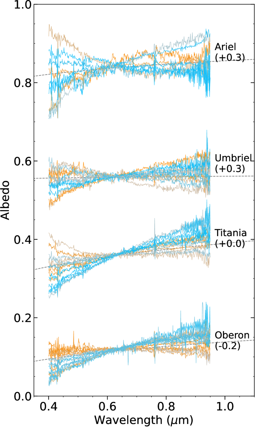 All of our acquired spectra for the Uranian moons (Tables 1 and 2). Each spectrum was normalized to the K2001 geometric albedo for that body at 0.63 μm (Section 3), then offset by the listed factor. Spectra are shaded by longitude: blue spectra are on the leading hemisphere, orange spectra are on the trailing hemisphere, and spectra with less saturated colors are intermediate longitudes. The photometric models of K2001 for each body are plotted as gray dashed lines behind the spectra. Spectra are binned by 3 pixels for clarity.