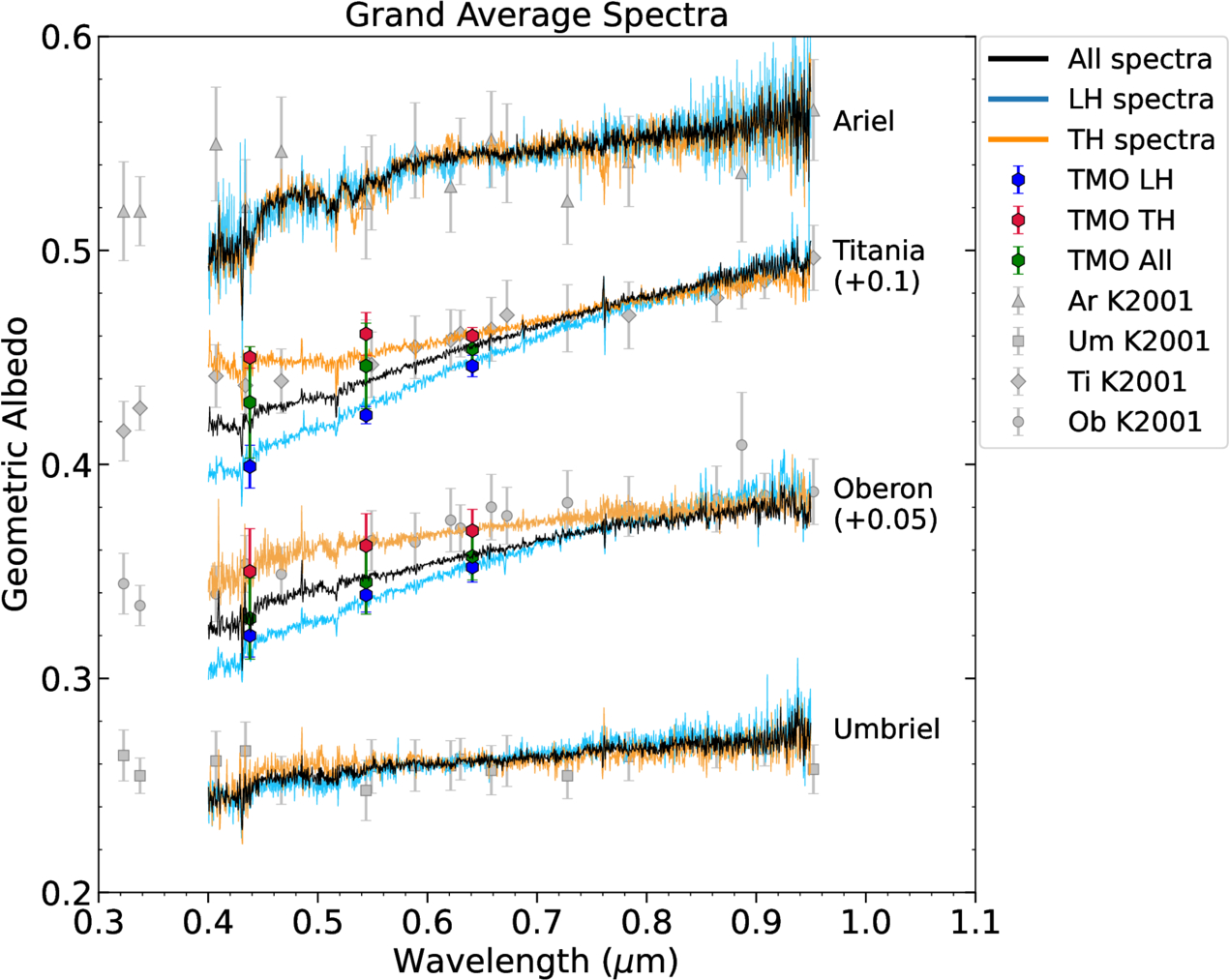 Grand average spectra of the leading hemisphere (LH, light blue), trailing hemisphere (TH, orange), and all spectra (black) for each moon. For Ariel and Umbriel, the LH, TH, and “all” grand averages are normalized to the E. Karkoschka (2001) geometric albedos in the F631N filter (0.63 μm). The LH, TH, and “all” spectra for Titania and Oberon are normalized to the LH, TH, and “all” average TMO R-band geometric albedos (blue, red, and green hexagons with error bars). Titania and Oberon are vertically offset by the listed amount for clarity; no offset was applied to Ariel or Umbriel. The gray points with error bars labeled as K2001 are the geometric albedo spectra for each body from E. Karkoschka (2001).