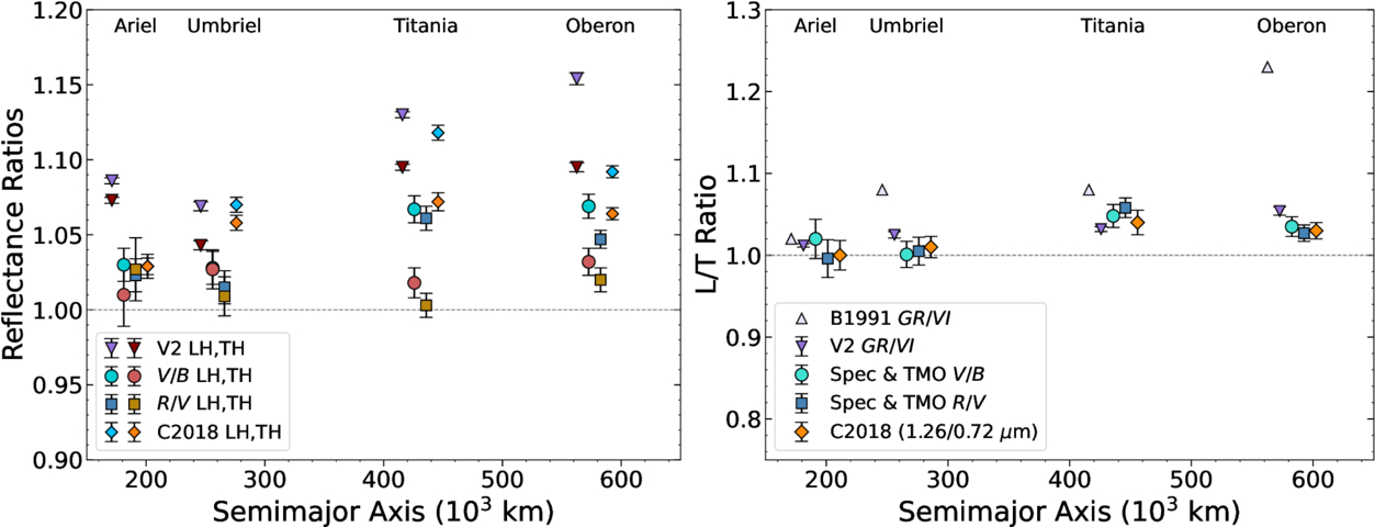 Left panel: the reflectance ratios of the leading hemisphere and trailing hemisphere for each moon, for different datasets and spectral ranges (Table 5). The different datasets for each moon are separated in semimajor axis (on the X-axis) for legibility. Our calculated averages of the Voyager 2 GR/VI longitudinal color scans from B1991 are plotted with purple (LH) and dark red (TH) triangles and labeled “V2.” The measured reflectance ratios in our spectra and photometry are plotted with turquoise (LH) and red (TH) circles for V/B, and dark-blue (LH) and brown (TH) squares for R/V. NIR reflectance ratios from R. J. Cartwright et al. (2018; C2018) are plotted with sky blue (LH) and orange (TH) diamonds. The global average colors are omitted from this plot for clarity. Right panel: the leading/trailing ratios of the reflectance ratios for each moon, for different datasets (Table 6). L/T ratios of the Voyager 2 GR/VI colors originally reported in Table IV of B1991 are plotted with lavender triangles; our “V2” L/T averages in GR/VI are plotted with purple triangles; our L/T ratios of the V/B and R/V colors in our spectra and photometry are plotted with turquoise circles and dark-blue squares; and NIR L/T spectral slope ratios from C2018 are plotted with orange diamonds.