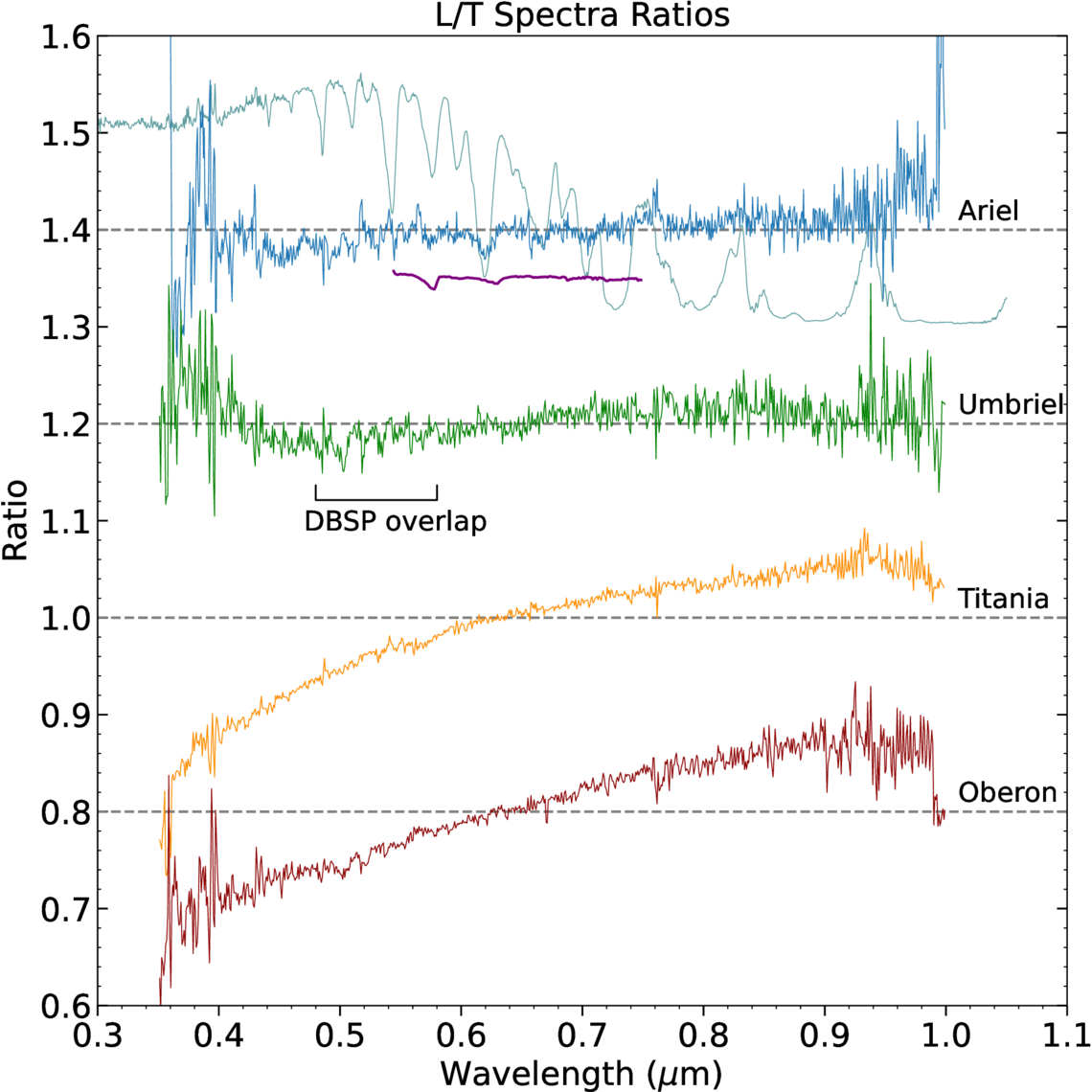 The grand average LH spectra of each moon divided by the grand average TH spectra, binned by 2 pixels and offset in ±0.2 increments. We have plotted an arbitrarily scaled and offset albedo spectrum of Uranus in light blue (E. Karkoschka 1998) behind the ratio spectrum of Ariel in order to emphasize which “features” are likely spurious. A reflectance spectrum of Ganymede displaying absorption features from dense-phase O2 is shown below the Ariel spectrum in purple (J. R. Spencer et al. 1995).