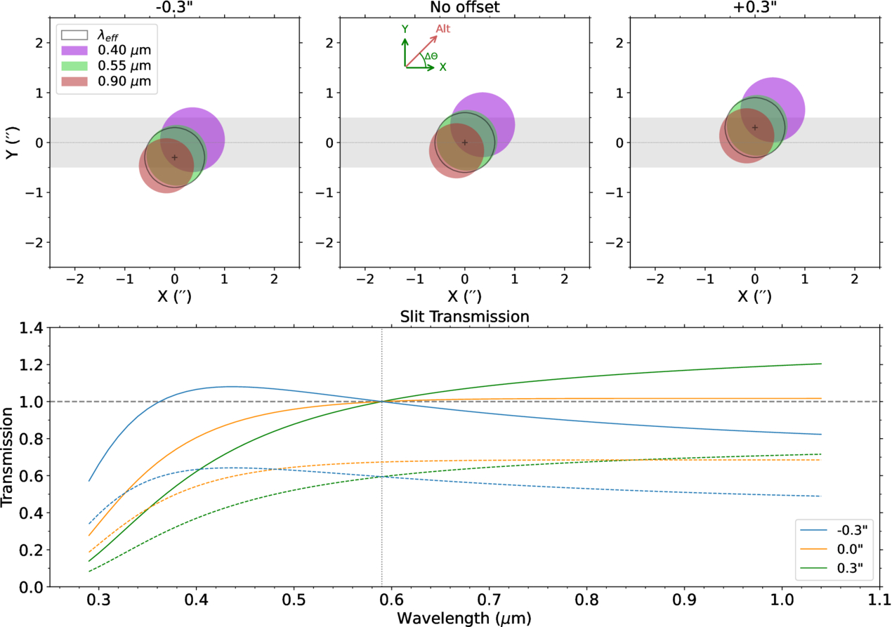 A demonstration of the effect that guiding errors can have on the light transmission through the slit when it is not aligned with the parallactic angle. In this example modeled after our DeVeny data and assuming realistic atmospheric conditions at the LDT, three panels across the top row demonstrate differential atmospheric refraction, with the target at the guide wavelength (0.59 μm) placed at varying offsets perpendicular to the width of a 1″ slit (gray rectangle): −0﹩\mathop{.}\limits^{\unicode{x02033}}﹩3 (top left), no offset (top center), and +0﹩\mathop{.}\limits^{\unicode{x02033}}﹩3 (top right). For this example, the slit is assumed to be oriented 45° from the parallactic angle, the target is at an airmass of 1.15, and the seeing FWHM at the guide wavelength (black unfilled circle) is 1﹩\mathop{.}\limits^{\unicode{x02033}}﹩2. Short-wavelength light (purple circle) has a larger seeing FWHM (size of circle) and is dispersed farther from the target’s true position (the + mark) than long-wavelength light (red circle). In the bottom panel, slit transmission relative to the guide wavelength (solid lines) and the absolute transmission through the slit (dashed lines) are plotted as a function of wavelength for each of the offsets in blue (−0﹩\mathop{.}\limits^{\unicode{x02033}}﹩3), orange (no offset), and green (+0﹩\mathop{.}\limits^{\unicode{x02033}}﹩3), respectively. Even when the object is perfectly centered, substantial amounts of light are lost at short wavelengths when a narrow slit is not aligned with the parallactic angle.