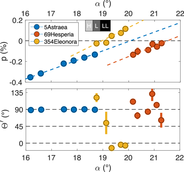 Lick 3 m POLISH2 measurements of three asteroids surrounding their inversion angles over a seven-night run. Note the sudden rotation of polarization orientation ﹩{{\rm{\Theta }}}^{{\prime} }﹩ for (354) Eleonora near α ∼ 19° (bottom panel, purple points), which causes fractional linear polarization p sign to change (top panel). The expected inversion angles of the parent bodies of H, L, and LL OCs are shown at the top of the figure based on laboratory measurements of their refractive indices (N. L. Bowen & J. F. Schairer 1935; T. Nakamura et al. 2011; R. Gil-Hutton & E. García-Migani 2017). Uncertainties are generally smaller than the size of the data points.