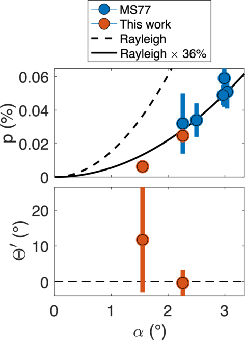 POLISH2 383−720 nm observations of Uranus obtained at α = 1﹩\mathop{.}\limits^{\unicode{x000b0}}﹩6 and 2﹩\mathop{.}\limits^{\unicode{x000b0}}﹩3 on UT 2018 September 22 and 2021 September 16, respectively, are compared with measurements from the literature (J. J. Michalsky & R. A. Stokes 1977). Top: fractional polarization p vs. α, which is consistent with Rayleigh scattering with 36.22% ± 0.89% efficiency. J. J. Michalsky & R. A. Stokes (1977) observations obtained at α < 2° are generally consistent with zero and are ignored here for clarity. Bottom: POLISH2 polarization orientation relative to the plane perpendicular to the scattering plane (﹩{{\rm{\Theta }}}^{{\rm{{\prime} }}}=0\mathop{.}\limits^{\unicode{x000b0}}39\pm 0\mathop{.}\limits^{\unicode{x000b0}}72﹩), which is consistent with Rayleigh scattering (dashed line). Note that J. J. Michalsky & R. A. Stokes (1977) only tabulate p and not ﹩{{\rm{\Theta }}}^{{\prime} }﹩.