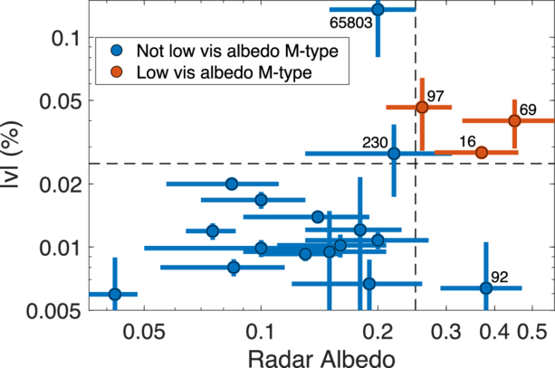 Lick 3 m POLISH2 observations of absolute fractional, optical circular polarization ∣v∣ as a function of S- or X-band radar albedo. Low visible albedo, M-type asteroids (red points) have both high radar albedo and high optical circular polarization. We detect a clear correlation between circular polarization and radar albedo except for two cases. The circularly unpolarized (92) Undina appears to be a rare M-type asteroid with high visual and radar albedos, and it is possible that (65803) Didymos’s circular polarization is contaminated by potentially bright, multiply scattering ejecta from the DART impact, or it may be a consequence of its observation at high phase angle. We propose that metalliferous bodies may be identified by absolute fractional circular polarization ∣v∣ > 0.025% = 250 ppm and radar albedo ﹩{\hat{\sigma }}_{\mathrm{OC}}\gt 0.25﹩ (dashed horizontal and vertical lines, respectively). The relatively large circular polarization of (230) Athamantis must be verified owing to its short, 22-minute observation.