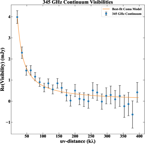 345 GHz continuum visibilities in K2, with best-fit coma model overlaid. The uv distances have been plotted in units of kλ.