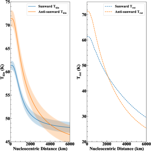 Left: sunward and antisunward best-fit radial kinetic temperature profiles for CH3OH in K2. The shaded regions show the 1σ uncertainties. Right: sunward and antisunward radial rotational temperature profiles calculated from the best-fit SUBLIME model rotational populations.