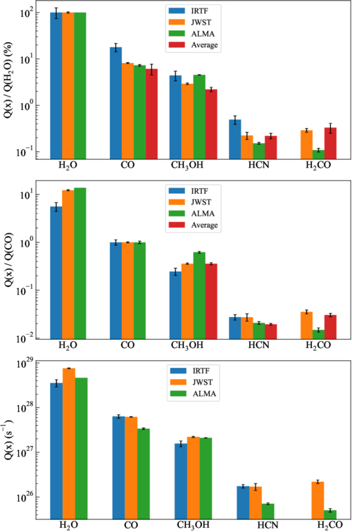 Upper: molecular abundances in K2 with respect to H2O measured with IRTF (C. Ejeta et al. 2025), JWST (C. E. Woodward et al. 2025), and ALMA (this work). Middle: same as the left panel, but for abundances with respect to CO. Lower: absolute molecular production rates measured with each facility. Mean values are taken from N. Dello Russo et al. (2016), N. X. Roth et al. (2023), and references therein.
