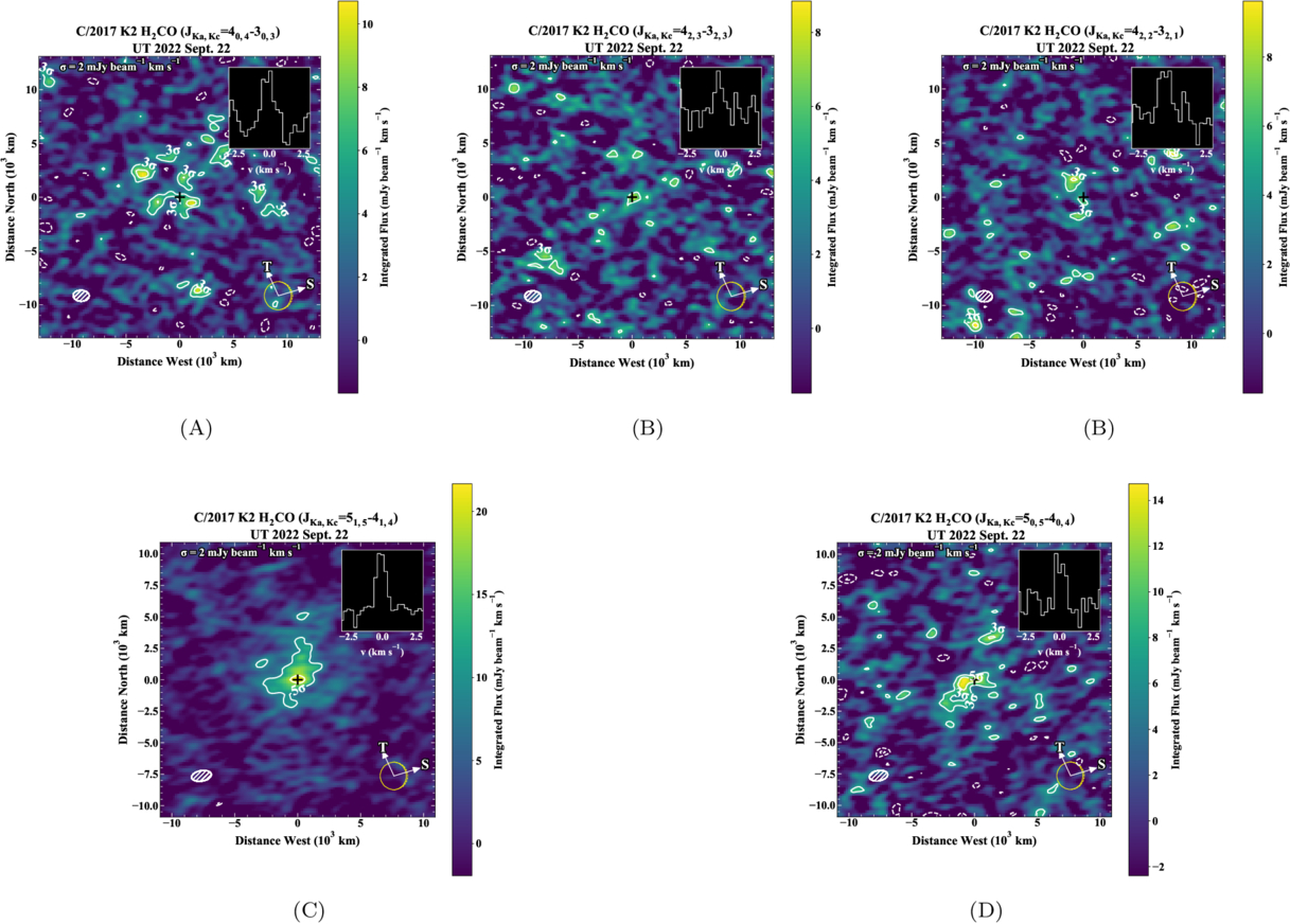 (a–d) Spectrally integrated flux maps for all detected H2CO transitions in K2, with traces and labels as in Figure 1. Contours are in 5σ increments for H2CO (JKa,Kc = 51,5 − 41,4). Contours are 3σ and 5σ for H2CO (JKa,Kc = 50,5–40,4), (JKa,Kc = 40,4–30,3), (JKa,Kc = 42,2 − 32,1), and (JKa,Kc = 42,3–32,3).