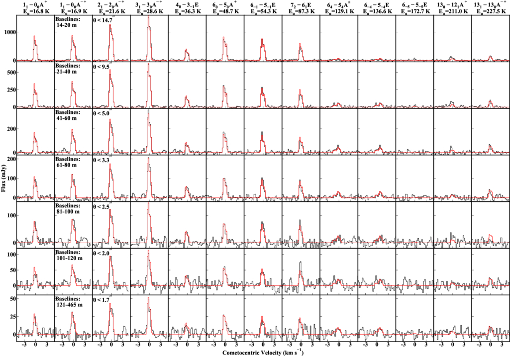 Observed spectra for all detected CH3OH transitions in K2, with the best-fit model overlaid in red. Each spectrum is averaged over a range of uv distances, provided in the upper left corner, corresponding to a range of angular scales in the coma.