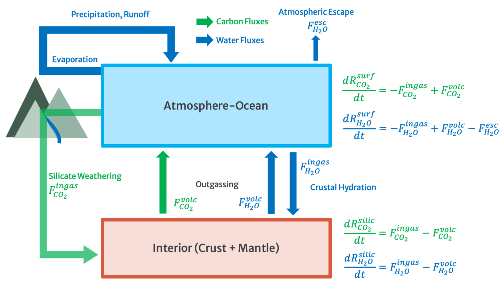 Schematic representation of the box model used in this study. Carbon fluxes are denoted by green arrows, and water fluxes are denoted by blue arrows. Our model is divided into two boxes: the surface (atmosphere and ocean) and the interior (mantle and crust). Equations (1)–(4) govern the transfer of H2O and CO2 in the system.