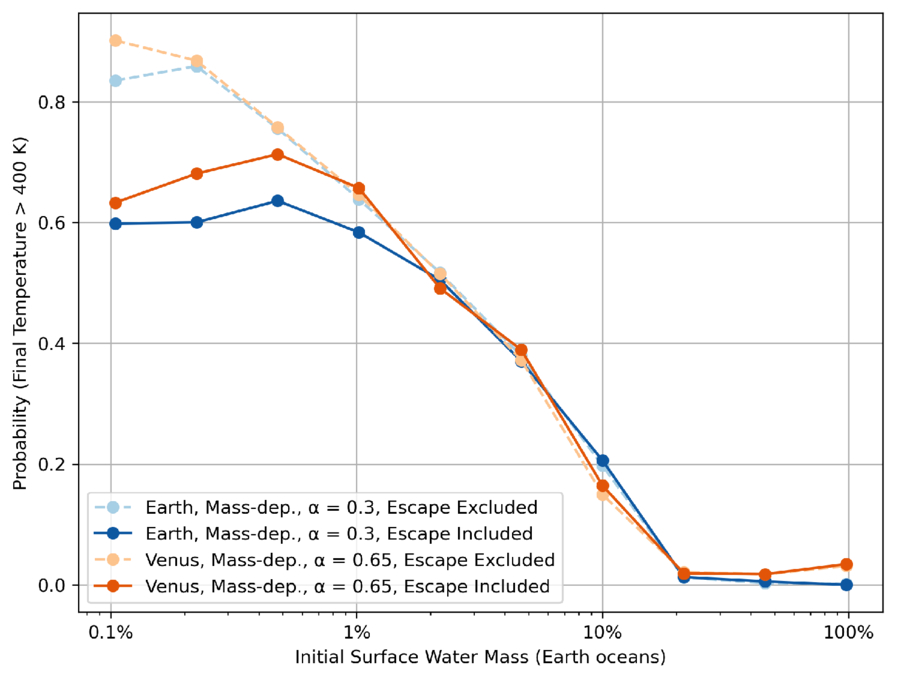 Probability plot showing the effect of escape processes at Earth-like and Venus-like instellations. Same as Figure 8 except that all models use mass-dependent water ingassing, as opposed to surface-dependent ingassing. Runs that exclude atmospheric escape are denoted by the dotted lines and lighter shades. Atmospheric escape is less significant to habitability outcomes at higher initial water inventories above ∼1% of Earth’s ocean mass.