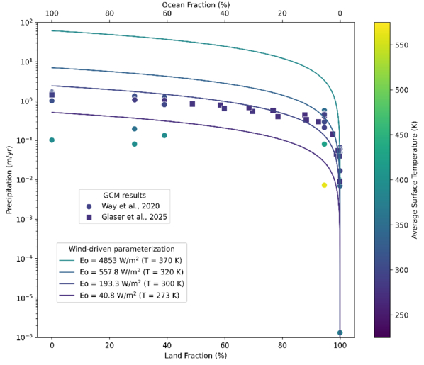 Precipitation estimated analytically for different surface temperatures assuming wind-driven evaporation limits (lines, R. T. Pierrehumbert 2010) is compared to the weighted average of precipitation from GCM runs of arid planets (dots, M. J. Way & A. D. Del Genio (2020; and square markers, D. M. Glaser et al. 2025). The average surface temperature associated with the calculated wind-driven precipitation and the GCM outputs are represented by a color heatmap. The M. J. Way & A. D. Del Genio (2020) GCM models tested five discrete land fractions, resulting in the five distinct dot groups. Broadly speaking the analytic precipitation-limited estimate of precipitation agrees with or overestimates precipitation from the GCMs.