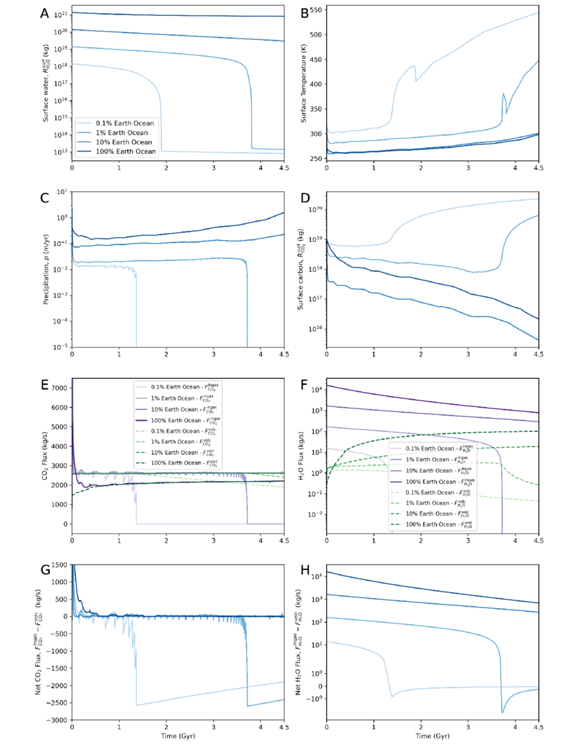 Four model outputs with varying initial water inventories denoted by blue shading. These outputs use a mass-dependent deep-water cycle, an albedo (α) of 0.3, and escape processes are included. (A) Mass of all surface water reservoirs over the planet’s 4.5 Gyr evolution. (B) Surface temperature. (C) Precipitation calculated from wind-driven evaporation. (D) Mass of all surface CO2 including atmospheric CO2 and dissolved carbon. The ingassing fluxes of CO2 (E) and H2O (F) for various initial water inventories are denoted by purple shading. Outgassing fluxes of CO2 (E) and H2O (F) are denoted by dotted green shading. (G) Net CO2 flux into the interior. (H) Net H2O flux into the interior. In model runs with larger (10%, 100% of Earth’s oceans) water inventories, surface temperatures are temperate through geologic time, but model runs with low initial water show runaway warming. Smaller (0.1%, 0.01% of Earth’s oceans) initial water inventories have an unbalanced carbon cycle, increasing the flux of surface water into the interior while suppressing H2O outgassing. With less surface water, precipitation rates decrease (C), and silicate weathering fluxes become runoff limited, allowing volcanic outgassing to dominate (E). This results in surface warming (B) and increased concentrations of atmospheric CO2 (D).