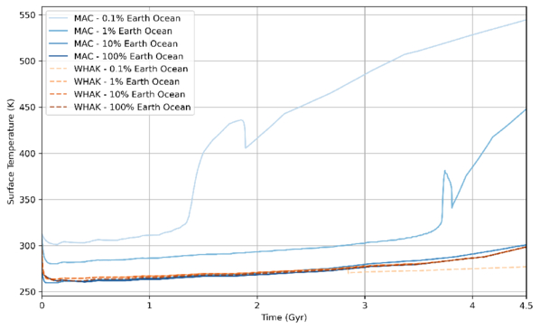Comparison of WHAK and MAC weathering formulations with our geologic carbon cycle model for a planet with Earth-like hypsometry and instellation (Bond albedo, α = 0.3). Mass-dependent water ingassing is assumed, and escape processes are included in these calculations. The WHAK model is denoted by shades of orange for varying initial water inventories, and the MAC model is denoted by shades of blue. Under the WHAK weathering formulation, the system maintains habitable temperatures even for very small initial surface water reservoirs. In contrast, the MAC model demonstrates a runoff dependency with runaway warming at low water inventories.