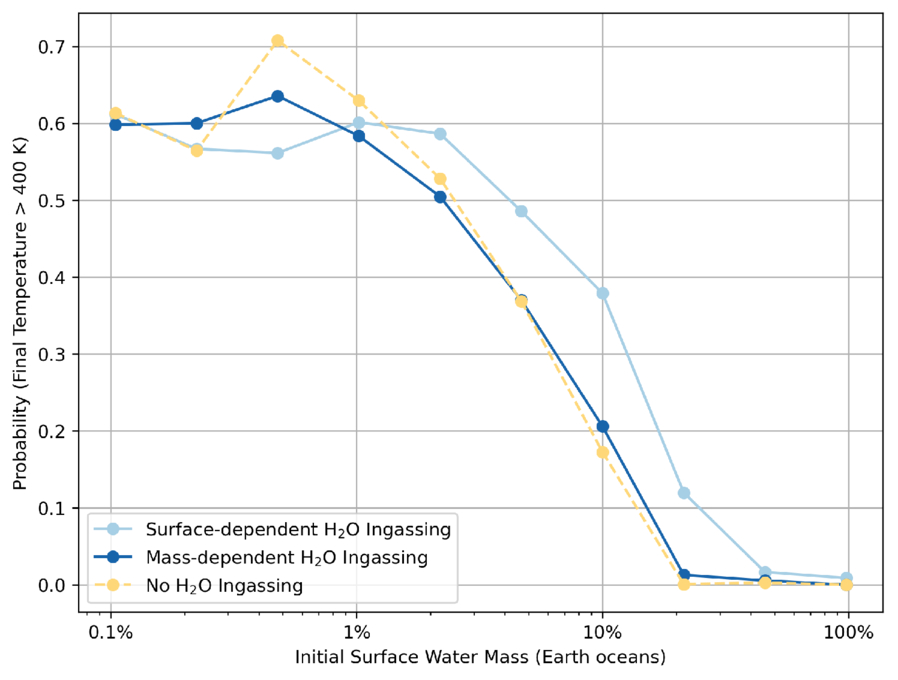 The probability of reaching a final surface temperature above 400 K for different initial surface water inventories at Earth-like instellation and hypsometry. Monte Carlo runs are divided into 10 evenly space logarithmic bins based on their initial surface water, ranging from 0.1%–100% of Earth ocean mass (1.4 · 1018–1.4 · 1021 kg). The bin center is calculated using the geometric mean of its edges. Lower probabilities correspond to more habitable conditions, as they are less likely to exceed the habitable temperature threshold of 400 K where proteins begin to denature (A. Clarke 2014). Surface- and mass-dependent parameterizations of the deep-water cycle are shown for an Earth-like planet (instellation, hypsometry) with α = 0.3 (blue lines). Additionally, we include a third end-member where water ingassing is zero (“no ingassing,” yellow line) meaning no water is transferred from the surface to the interior. The mass-dependent case is more likely to be habitable at lower initial water inventories, with ∼15% of an Earth ocean marking the transition between a balanced and imbalanced carbon cycle evolution.