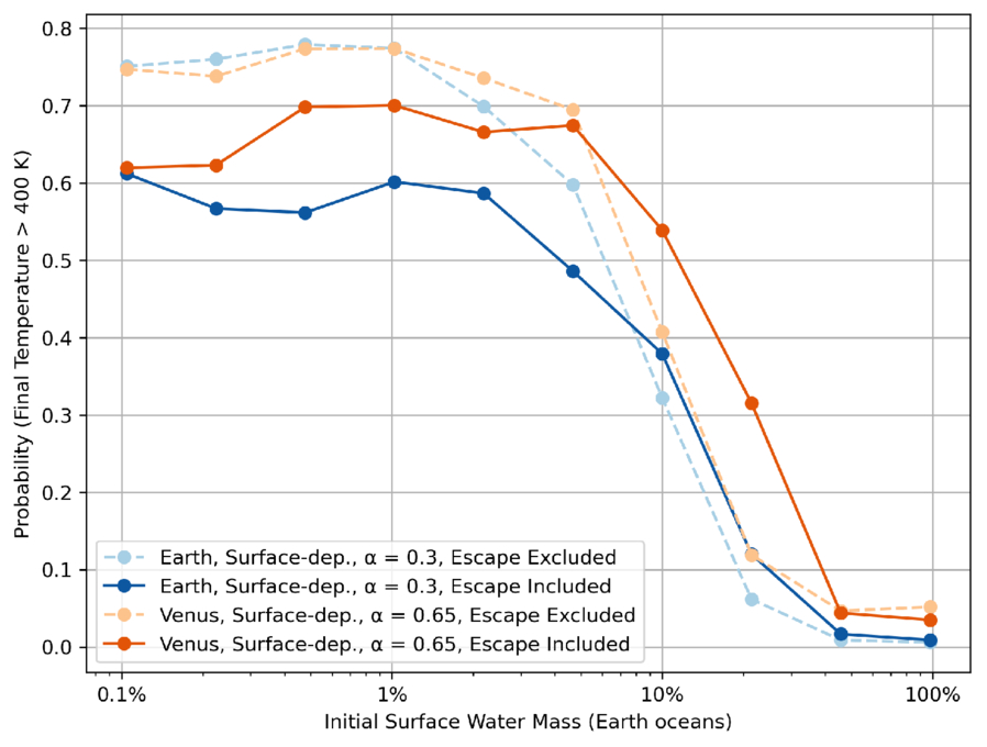 Probability plot showing the effect of escape processes at Earth-like and Venus-like instellations. Venus-like hypsometry and instellation is denoted by orange shades, and Earth-like models are in shades of blue. All models use surface-dependent water ingassing cycles. Runs that exclude atmospheric escape are denoted by the dotted lines and lighter shades. Atmospheric escape is less significant to habitability outcomes at higher initial water inventories above 10% of Earth’s ocean mass.