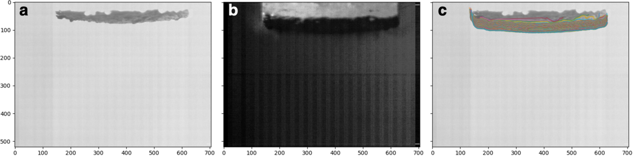 Sequence of frames for experiment CI_LG_HyFire001, looking down into the chamber (the impact direction is from the top of the page toward the bottom). The images show the largest fragment of this disruptive impact. (a) First frame in sequence that is overexposed owing to the flash used to capture the impact for the higher frame rate side-view cameras. (b) Final frame, 15 ms after panel (a). (c) Edges of the fragment in each frame, shown here superimposed on the first frame.