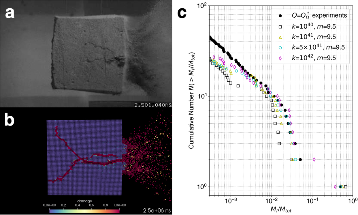 Comparison of a disruptive impact experiment (CI_LG_HyFIRE_001) (a) to an SPH simulation (Sim #4) (b) at 2.5 ms after impact. The extent of damage (scalar damage parameter, d) in the simulation is indicated by color, with red indicating fully damaged. (c) We conducted impact simulations that matched laboratory experimental conditions, varying the Weibull parameter, k (e.g., W. Benz & E. Asphaug 1994), and compared the CMFD results of simulations to the experiments, finding a best correspondence for m = 9.5 and k = 5 × 1041 cm3. The number of SPH particles in each simulation is ∼730,000.