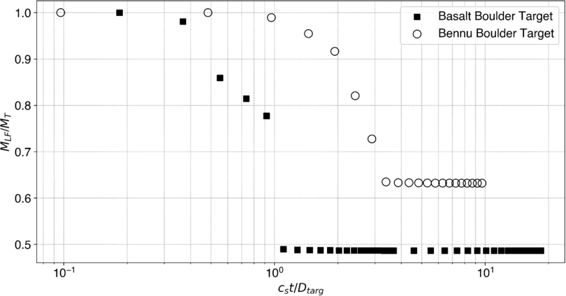 The simulations of disruptive impacts into 50 m diameter targets of different material types at 5.3 km s−1 were run for sufficiently long (0.2 s) that the mass of the largest remnant (MLF/MT) converges. The data points show the evolution of MLF/MT as a function of a p-wave crossing time, cst/Dtarg, where cs is the material sound speed, t is simulation time, and Dtarg is the target diameter.