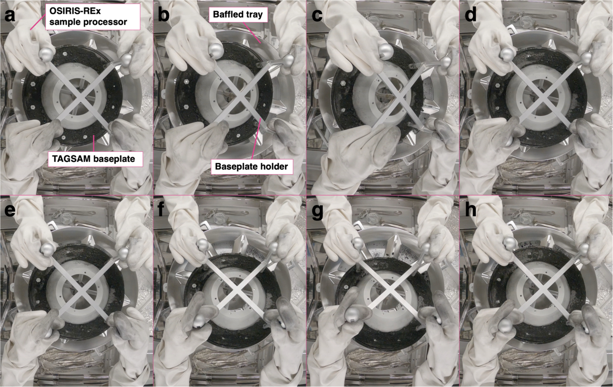 Sequence of frames from an ARMCam, capturing the pour-out of Bennu material by NASA JSC processors from the TAGSAM onto a baffled tray system inside the glovebox. The processors installed a four-handled baseplate holder onto the TAGSAM baseplate and then carefully tilted the baseplate until material was mobilized by gravity. (a–d) The processors tilting the TAGSAM, toward the right in this view, until material begins to move and fall into the baffled tray. (e–h) Same as panels (a)–(d), but with the tilt direction toward the top of the page.