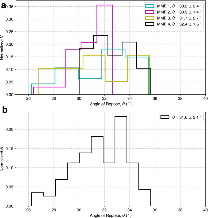 (a) Distribution of angle-of-repose (θ) measurements for each MME. (b) Distribution of angle of repose over all measurements (N = 123). We find a median value of θ = 31﹩\mathop{.}\limits^{\unicode{x000b0}}﹩8 ± 2﹩\mathop{.}\limits^{\unicode{x000b0}}﹩1 across the four MME measurements.