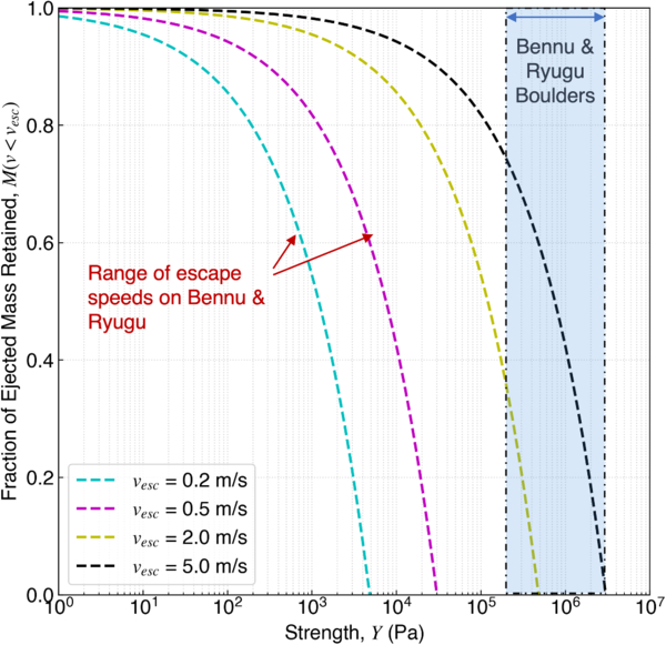 Fraction of ejected mass retained, M(v < vesc), from cratering impacts into material with strength Y, and assuming material constants similar to that of weakly cemented basalt, cs = 0.122 and β = 1 (A. M. Nakamura 2017), for ρ = 1.8 g cm−3. The cyan, magenta, yellow, and black dashed curves show M(v < vesc) for vesc = 0.2, 0.5, 2.0, and 5.0 m s−1. The escape speeds for Bennu and Ryugu range from 0.2 to 0.5 m s−1. Cratering impacts into Bennu and Ryugu boulders, which have an estimated Y ∼ 0.2–2 MPa (R.-L. Ballouz et al. 2020), would lead to all of the fragments escaping the asteroid.
