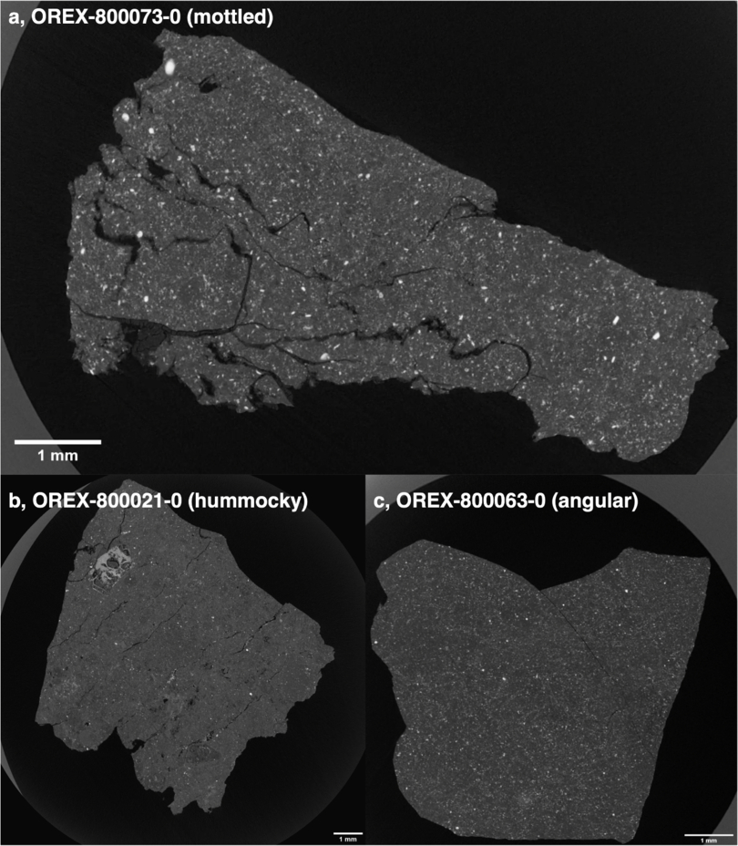 Examples of the XCT cross sections of Bennu samples with impact craters that show the range in internal fracture density observed in the samples. (a) XCT cross section of the mottled stone OREX-800073-0. (b) XCT cross section of the hummocky stone OREX-800021-0. (c) XCT cross section of the angular stone OREX-800063-0.