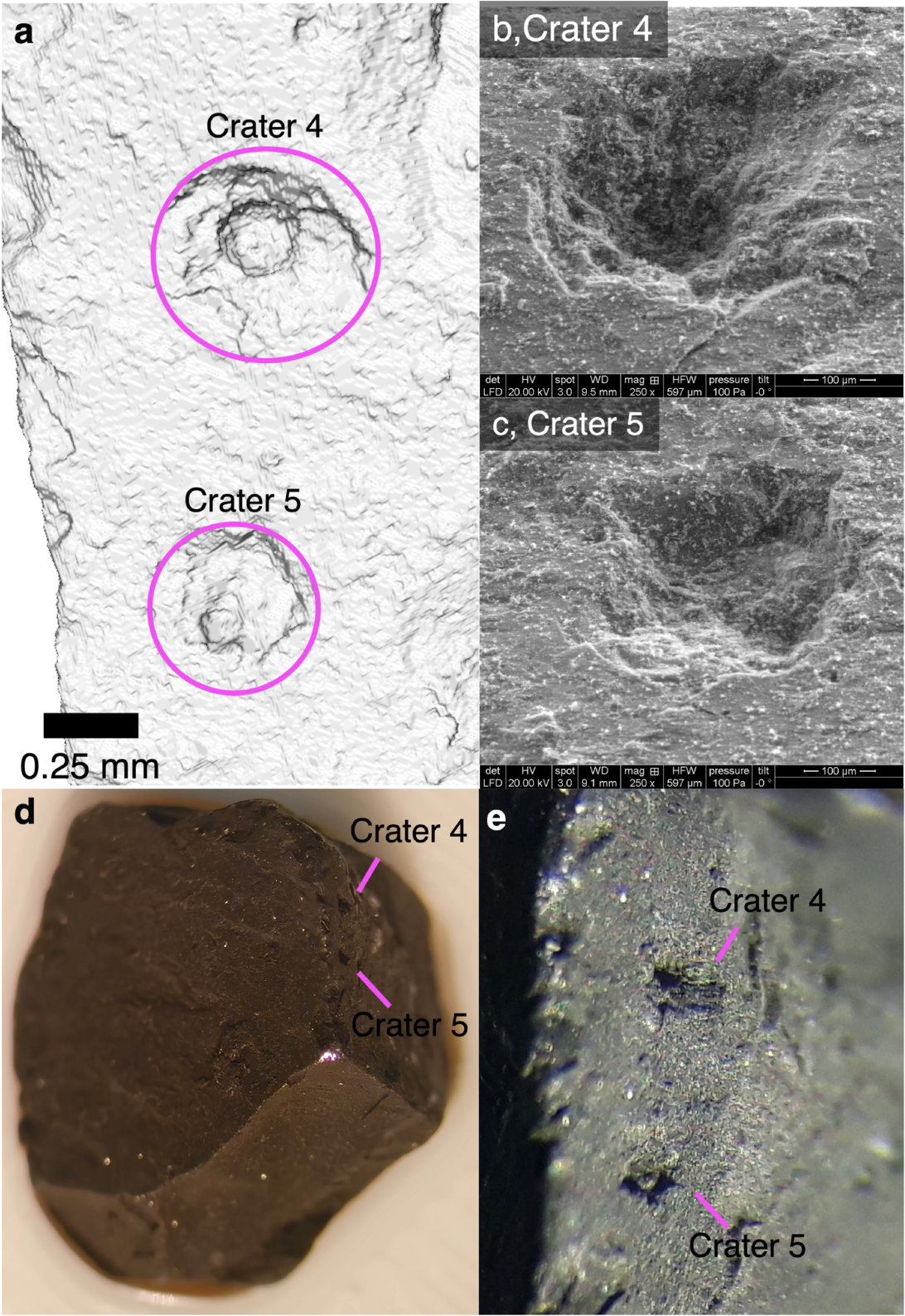 Detailed views of craters 4 and 5 (Figure 3(g)) on angular stone OREX-800123-0. (a) Close-up view of the craters in an XCT-derived shape model. (b, c) SEM image of craters 4 and 5, respectively. (d) Microscope context image of OREX-800123-0 with the craters in an oblique view. (e) magnified microscope image of OREX-800123-0 with the craters in an oblique view.