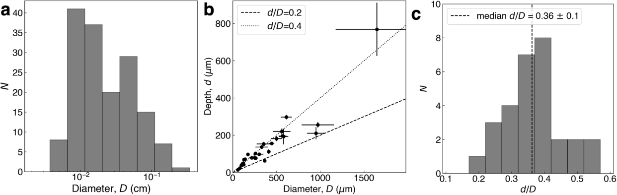 Depth, d, and diameter, D, of the craters on centimeter-scale Bennu samples. (a) Histogram showing the distribution of all 143 craters mapped on Bennu samples in this study. (b) The d of a subset of 40 of the largest craters as a function of their D, showing how the population clusters around d/D = 0.4 (dotted black line), with a minority reaching values as small as d/D = 0.2 (dashed black line). (c) A histogram of the crater d/D values from panel (b), which have a median of 0.36 ± 0.1. The values are not normally distributed, and there are some outlier craters with deep d/D.