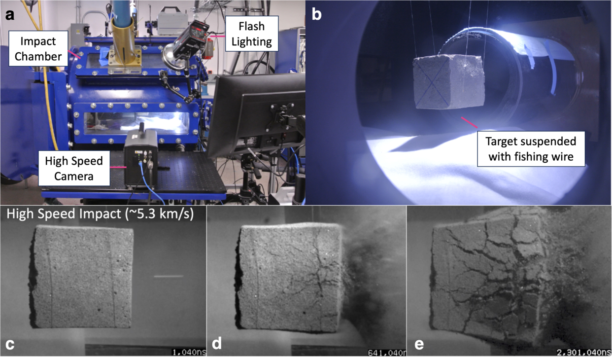 (a) Impact chamber and diagnostics setup at the Hopkins Extreme Materials Institute’s HyFIRE facility. (b) A target suspended with fishing wire. Panels (c)–(e) show example images from experiment CI_LG_HyFire_004, one of three head-on impact experiments at ∼5.3 km s−1. (c) The target right before impact (0.001 ms after firing). The projectile is the white streak on the right. (d) Approximately 0.64 ms after impact, the target begins to fracture. (e) Approximately 2.3 ms after impact, the target is fully disrupted. The largest post-impact fragment from this impact is 4.4% of the mass of the target.