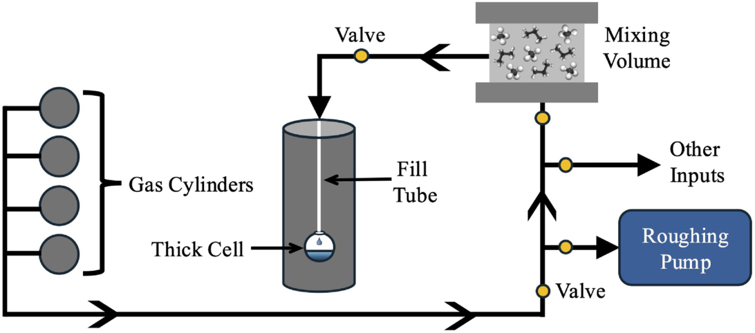 An illustration of the Astrophysical Materials Lab thick cell setup. The gas cylinders are connected to the mixing volume, roughing pump, and thick cell via stainless steel tubing with valves to control the flow of gases into the system. After mixing our gaseous sample in the 0.5-liter mixing volume, we deposit the sample from the top of the chamber downward through the fill tube.