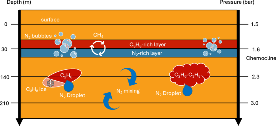 Visual depiction of chemistry that may occur in a Titan sea based on this work. The different depths and corresponding pressures are taken from the literature (M. Mastrogiuseppe et al. 2014, 2019; S. P. Tan et al. 2019). Prominent phenomena at these pressures, based on experimental work presented here, include formation of nitrogen bubbles, chemoclines, and compositional stratification of liquid layers.