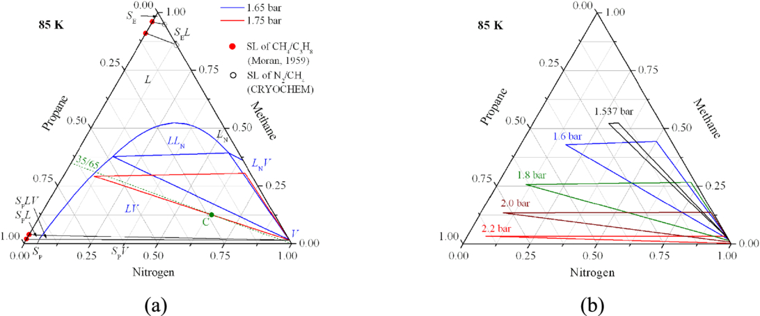 Composition diagram of N2/CH4/C3H8 at 85 K: (a) plotted with all phases at 1.65 bars—regions with solid phases are for estimates only (see text); (b) plotted only the three-phase LLV region at several pressures.