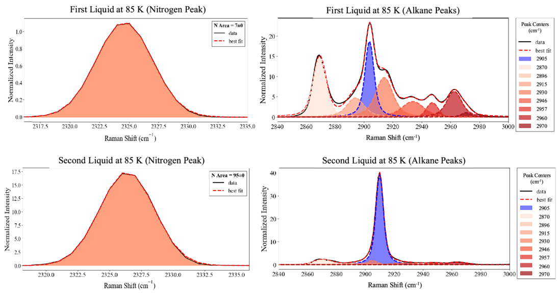 Examples of Voigt profiles for the nitrogen peak (2325 cm−1) and the alkane region (2840–3000 cm−1) for the first and second liquids of a methane–propane–nitrogen LLV. The methane peak is shown in blue, while the propane peaks are plotted in a red gradient.