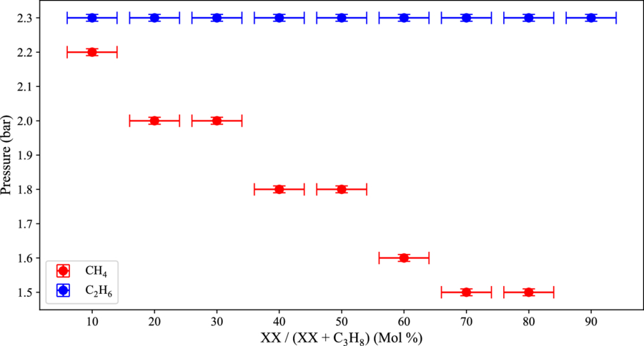 Pressure of the second liquid formation at 85 K for CH4 (red) and C2H6 (blue) mixtures for each tested composition, where XX is the mole fraction of either CH4 or C2H6. Note that for 90/10 CH4/C3H8 there was no second liquid at 85 K.