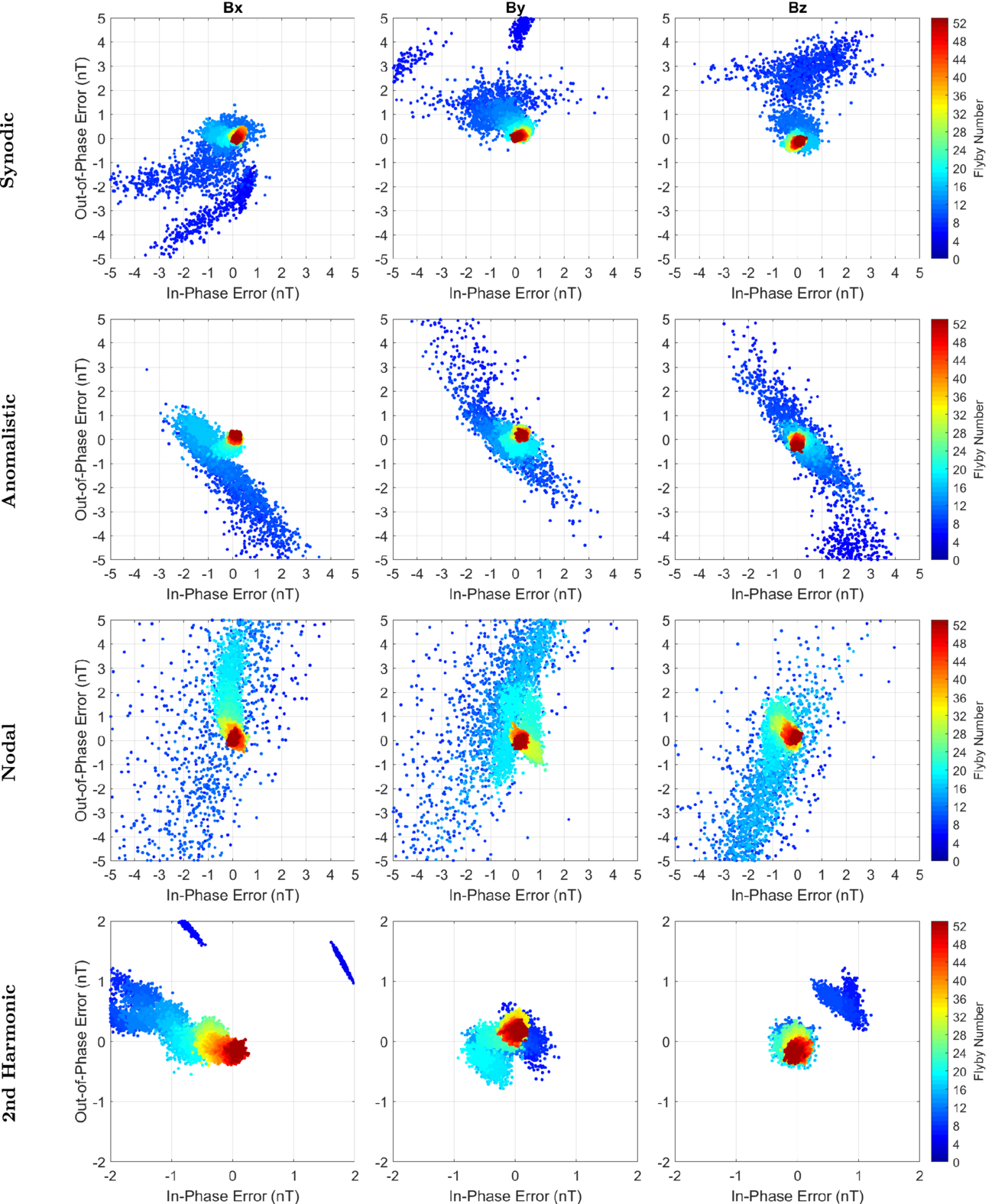 In-phase and out-of-phase errors associated with the inversion of Jupiter’s magnetic field. The (left column) Bx, (middle column) By, and (right column) Bz errors are shown for the synodic, anomalistic, nodal, and second harmonic periods.