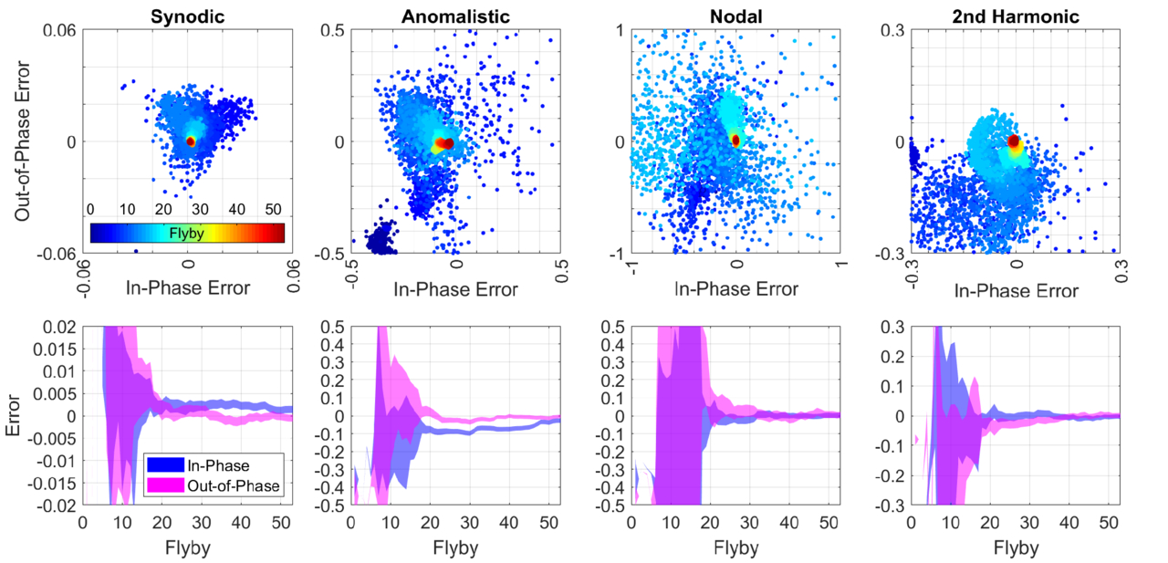 Induction parameter errors from the Monte Carlo simulation. (Top row) Complex response parameter errors associated with the inversion of the induction field for the four dominant periods. Each dot represents the error from an individual Monte Carlo simulation, and its color reflects the flyby number for which it was evaluated. (Bottom row) These figures show the envelope of the in-phase and out-of-phase errors as a function of Europa Clipper flyby number.