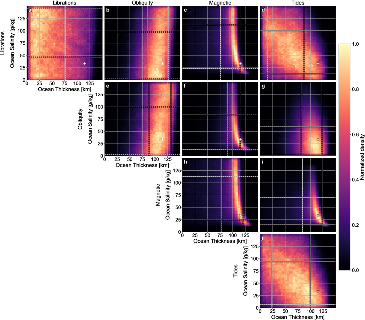 Histograms for ocean thickness and salinity derived from the inversion of multiple combinations of geophysical constraints. The organization of this figure is the same as Figure 6. The white dashed lines represent the 68% credible interval. The white plus sign represents the reference model used as ground truth.