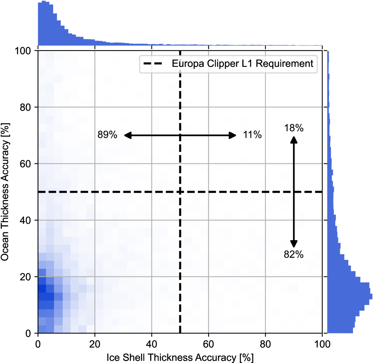 Histograms for ocean and ice shell thicknesses retrieval accuracy. The accuracy is represented by the relative error, defined as the difference between the true (reference) value and the central value (mean of the distribution) estimated by the MCMC, divided by the former. The black dashed line is Europa Clipper’s interior L1 requirement. Each sample in the histogram is the result of a full MCMC joint inversion of all the geophysical measurements. The arrows indicate the fraction of cases below or above the L1 accuracy requirement for both the ice shell and ocean thicknesses. Cases that do not meet the requirement are end-member models with substantially thin (only a few kilometers) shells or oceans.