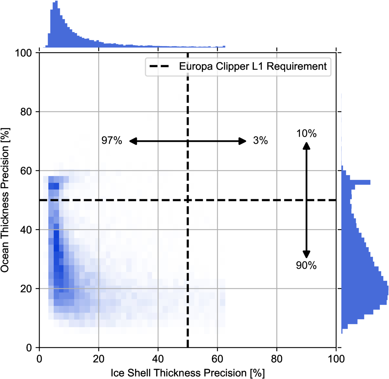 Histograms for ocean and ice shell thickness retrieval relative precision. The relative precision is computed as the ratio between the width of the 68% credible interval (1σ equivalent) and the posterior mean. The black dashed line is Europa Clipper’s interior L1 requirement. Each sample in the histogram is the result of a full MCMC joint inversion of all the geophysical measurements.