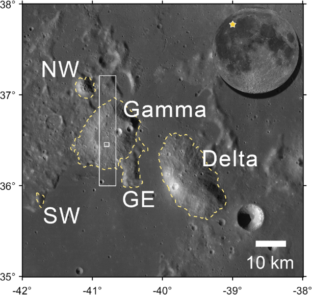A portion of the Lunar Reconnaissance Orbiter Camera (LROC) Wide Angle Camera (WAC) morphologic global mosaic (E. J. Speyerer et al. 2011; R. V. Wagner et al. 2015) showing the Gruithuisen domes region. The yellow dashed lines outline the Gamma dome, Gamma Extension (GE), Delta dome, Northwest (NW) dome, and southwest (SW) dome. The larger white box is the location of Figure 2 and the smaller white box is the location of Figure 3. The inset lunar globe shows the location of the Gruithuisen domes on the nearside (yellow star). (NASA/GSFC/Arizona State University.)