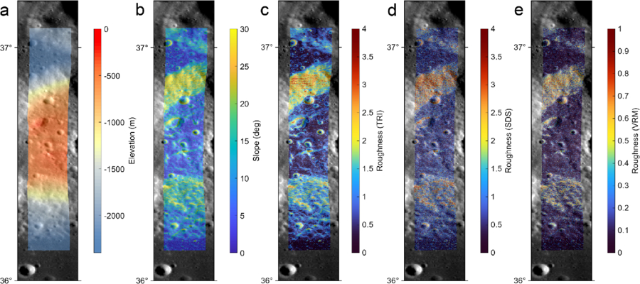 Lunar Reconnaissance Orbiter Camera (LROC) Wide Angle Camera (WAC) mosaic showing a portion of the Gamma dome overlaid with (a) elevation, (b) slope, (c) terrain ruggedness index (TRI), (d) standard deviation of slope (SDS), and (e) vector ruggedness measure (VRM) derived from the NAC Gruithuisen Domes (8) DTM (M. R. Henriksen et al. 2017). The VRM values were linearly mapped to values 0 to 1, and contrast-limited adaptive histogram equalization (S. M. Pizer et al. 1987) was applied to stretch the colors.